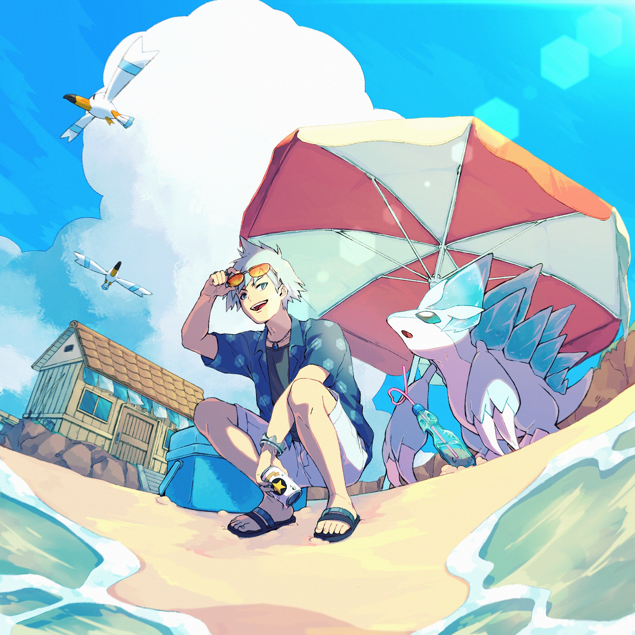 1boy adjusting_eyewear alolan_form alolan_sandslash aqua_eyes building can cloud commentary_request cooler day eyewear_on_head gen_3_pokemon gen_7_pokemon gigu_(tak_love-ya) hand_on_eyewear highres holding holding_can jewelry necklace nintendo official_alternate_costume open_mouth outdoors pokemon pokemon_(creature) pokemon_masters_ex sand sandals shirt shore shorts silver_hair sky steven_stone steven_stone_(summer_2020) sunglasses teeth toes tongue water white_shorts wingull
