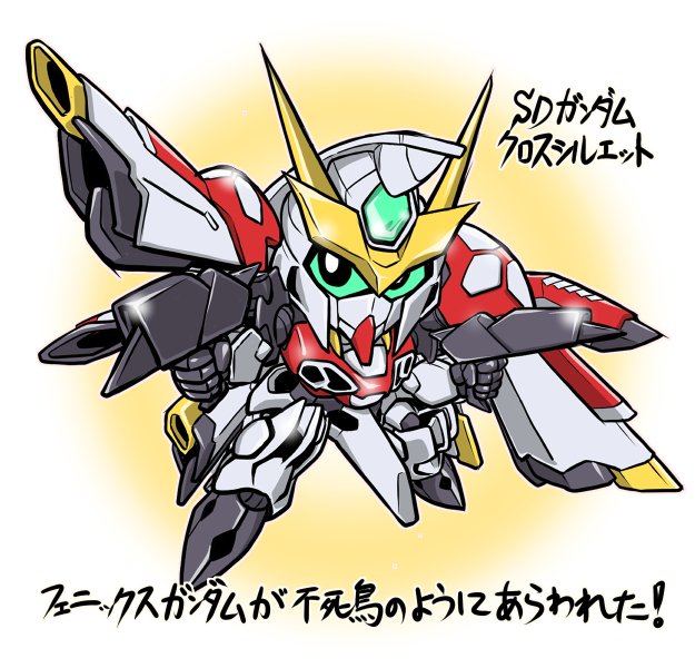chibi clenched_hands copyright_name dual_wielding green_eyes gundam holding looking_at_viewer mecha mechanical_wings no_humans oyomesandazo phoenix_gundam robot sd_gundam_g-generation_cross_rays sd_gundam_g_generation sd_gundam_g_generation_original solo v-fin wings