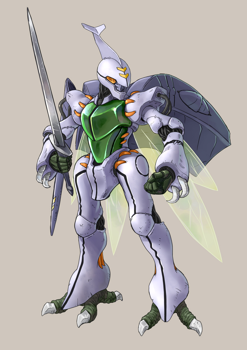 blade cable claws commentary_request damaged dirty dunbine fantasy highres insect_wings jetpack katahira_masashi machinery mecha nail_(hardware) official_style radio_antenna robot science_fiction seisenshi_dunbine sheath simple_background solo sword talons thrusters weapon wings wrist_blades