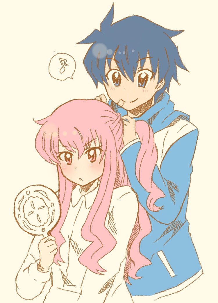 1boy 1girl beige_background blue_eyes blue_hair blue_jacket blush hairband hairdressing hand_mirror hiraga_saito jacket louise_francoise_le_blanc_de_la_valliere mirror pink_eyes pink_hair shirt simple_background track_jacket tsundere white_shirt yasai zero_no_tsukaima