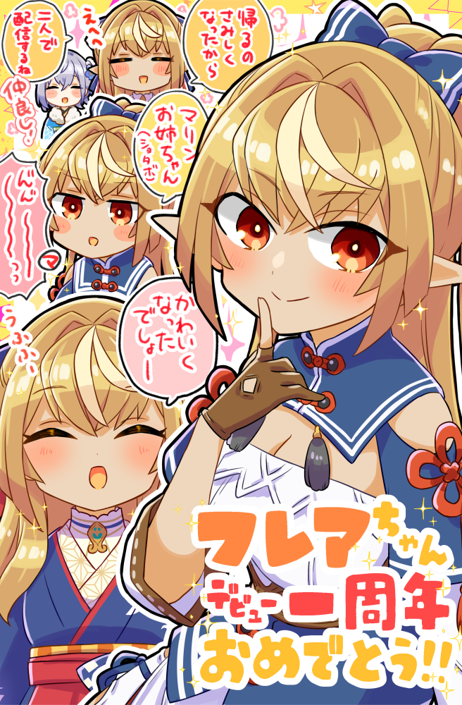 1girl ^_^ alternate_costume blonde_hair blush blush_stickers breasts chibi chibi_inset cleavage closed_eyes closed_mouth dark-skinned_female dark_skin detached_sleeves elf finger_to_mouth fingerless_gloves gloves high_ponytail hololive index_finger_raised japanese_clothes kimono long_hair looking_at_viewer multiple_views namu76 obi official_alternate_costume open_mouth pointy_ears ponytail sash shiranui_flare shiranui_flare_(new_year) sidelocks smile translation_request upper_body v-shaped_eyebrows virtual_youtuber