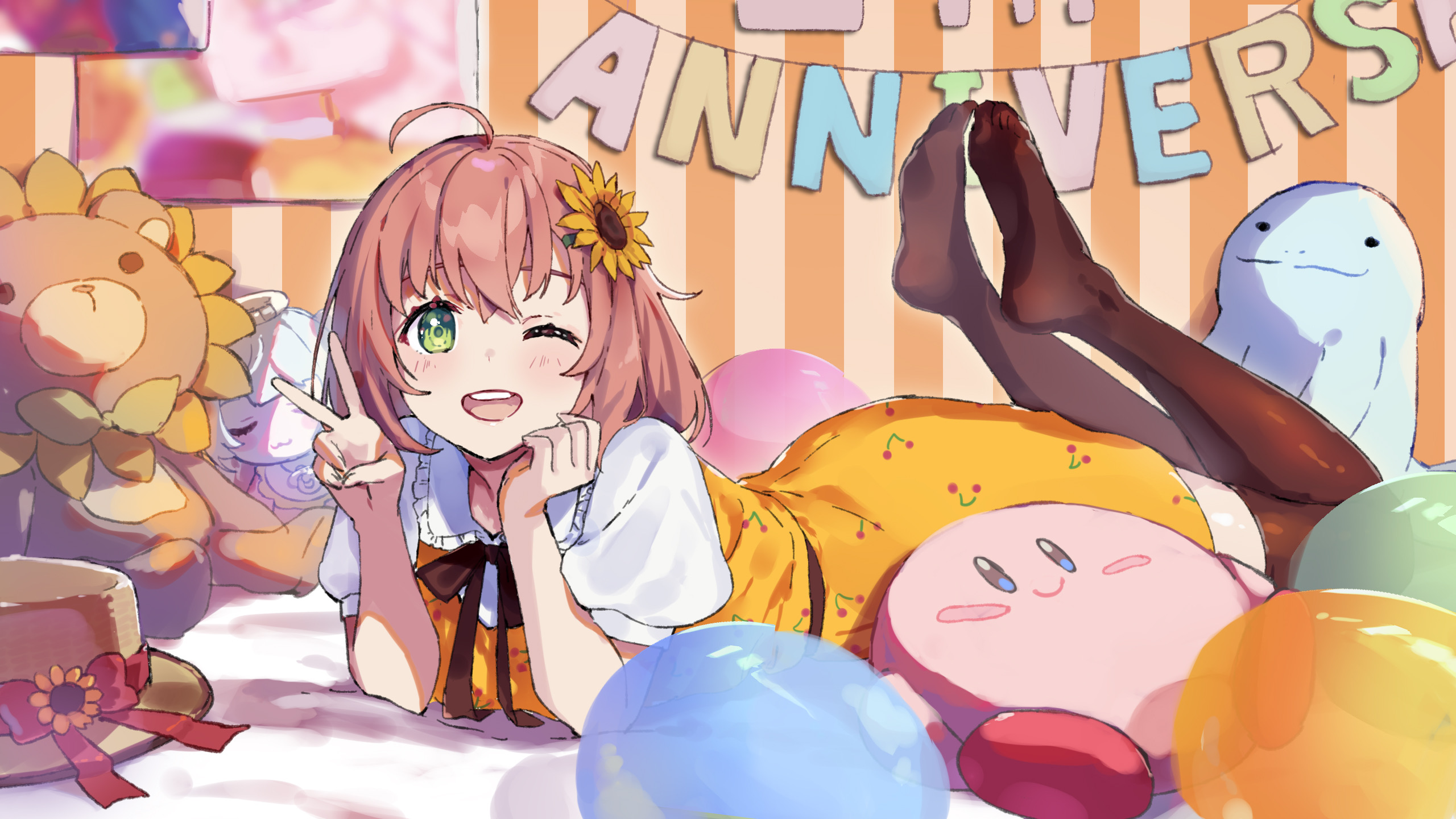 ahoge anniversary balloon bed character_doll doll dress flower gen_2_pokemon hair_flower hair_ornament highres himawari honma_himawari kirby kirby_(series) lying nijisanji nintendo on_stomach pokemon pokemon_(creature) quagsire short_hair smile solo sunflower sunflower_hair_ornament teeth thighhighs upper_teeth_only virtual_youtuber yumesaki_nana