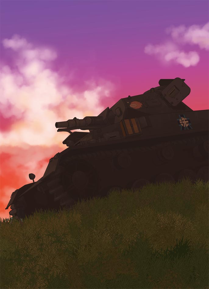 anglerfish caterpillar_tracks cloud emblem evening fish girls_und_panzer grass kabaya_kousuke military military_vehicle motor_vehicle no_humans ooarai_(emblem) panzer_iv panzer_iv sky tank vehicle_focus