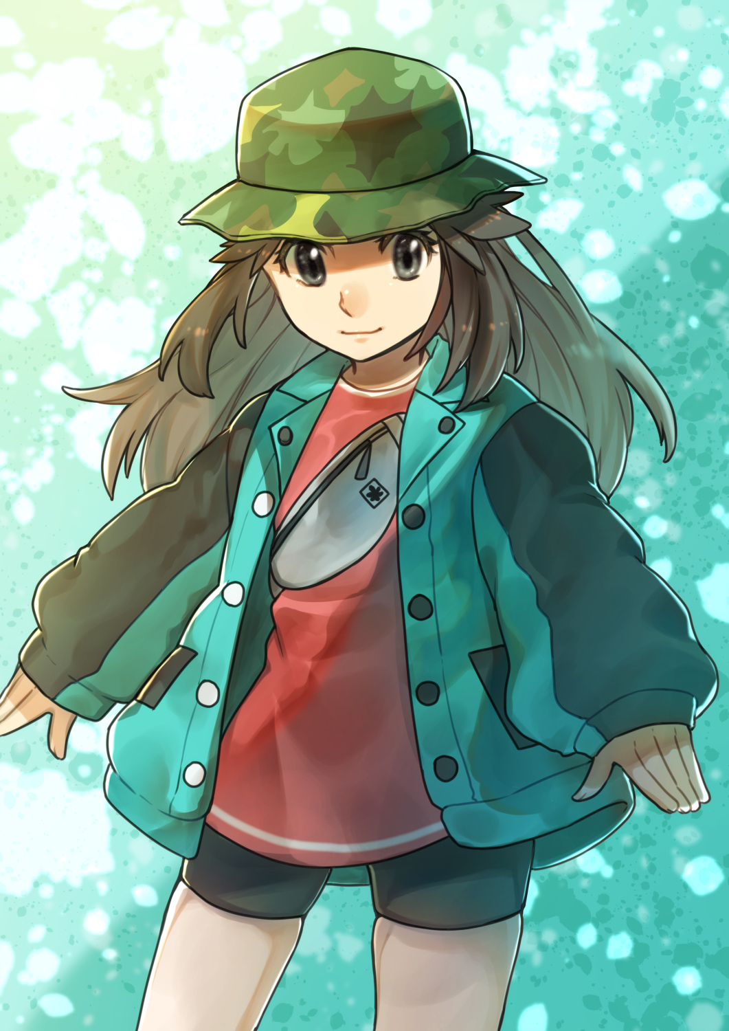 1girl bike_shorts brown_hair buttons camouflage camouflage_headwear closed_mouth commentary_request cowboy_shot eyelashes green_jacket grey_eyes hat highres jacket leaf_(pokemon) leaf_(sygna_suit)_(pokemon) long_hair long_sleeves meru_(merumumu) nintendo official_alternate_costume pokemon pokemon_masters_ex red_shirt shirt smile solo