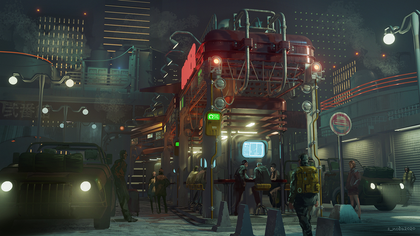3girls 6+boys backpack bag black_hair blurry building car chair city convertible dark diner hands_in_pockets lamppost motor_vehicle multiple_boys multiple_girls night noba original outdoors restaurant road road_sign scenery sign signature sitting stairs standing steam street vest walking