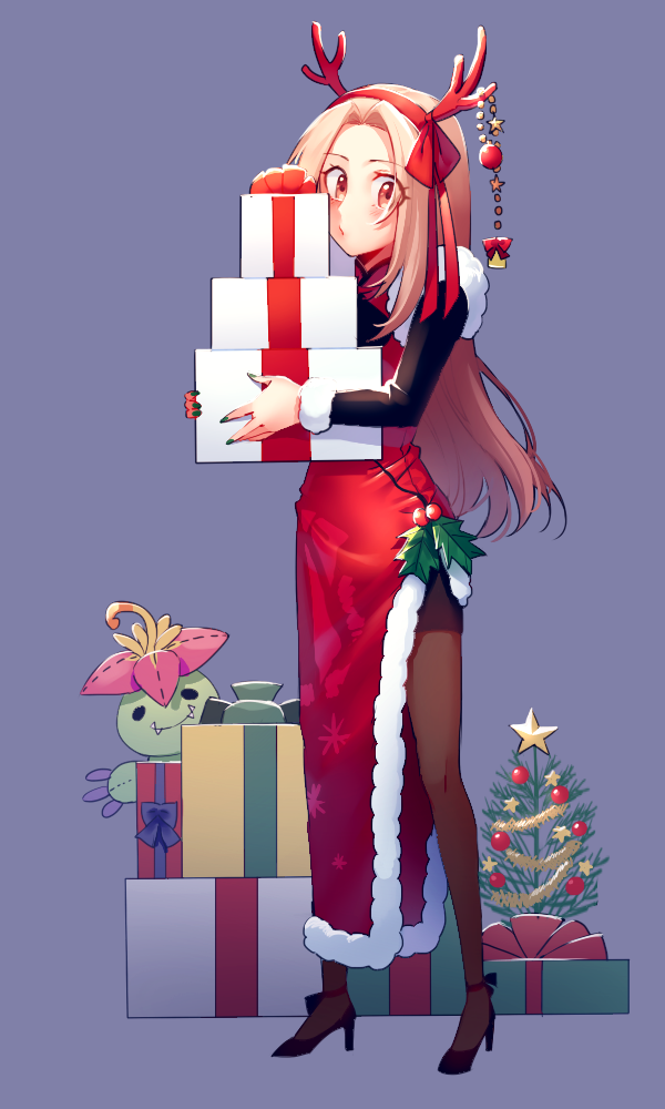 1girl bad_id bad_tumblr_id black_pantyhose black_shirt black_shoes blush box brown_eyes brown_hair character_doll christmas christmas_ornaments christmas_tree commentary digimon digimon_adventure doll dress english_commentary fake_antlers full_body fur-trimmed_dress fur_trim gift gift_box green_nails hairband high_heels holding holding_box long_hair maro_(lij512) nail_polish palmon pantyhose purple_background red_dress red_hairband shirt shoes side_slit simple_background solo standing tachikawa_mimi