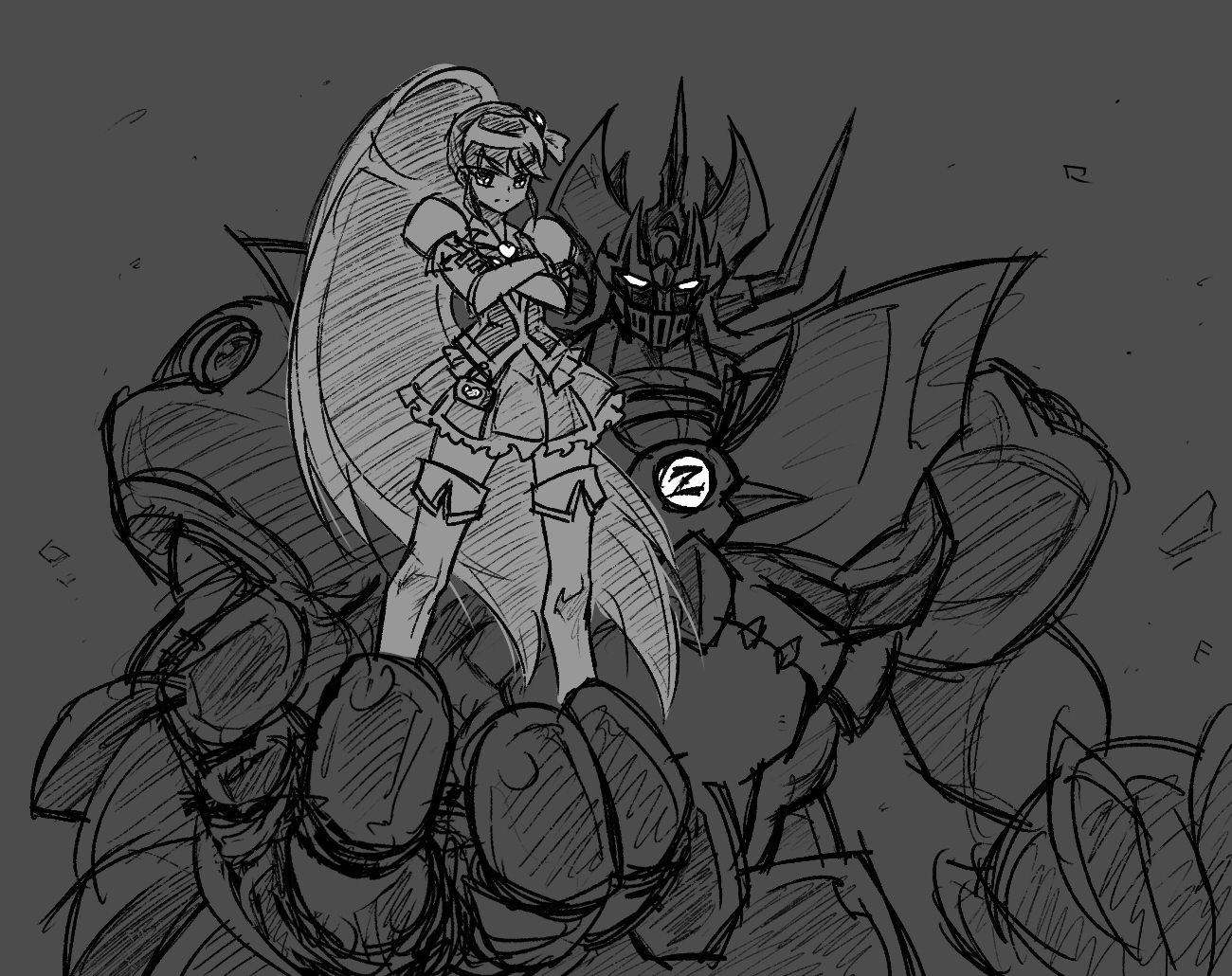 1girl aino_megumi crossed_arms crossover cure_lovely greyscale hamuten_(hmltzero) happinesscharge_precure! holding_person long_hair looking_at_viewer mazinger_(series) mazinkaiser mazinkaiser_(robot) mecha monochrome ponytail precure robot sketch super_robot very_long_hair