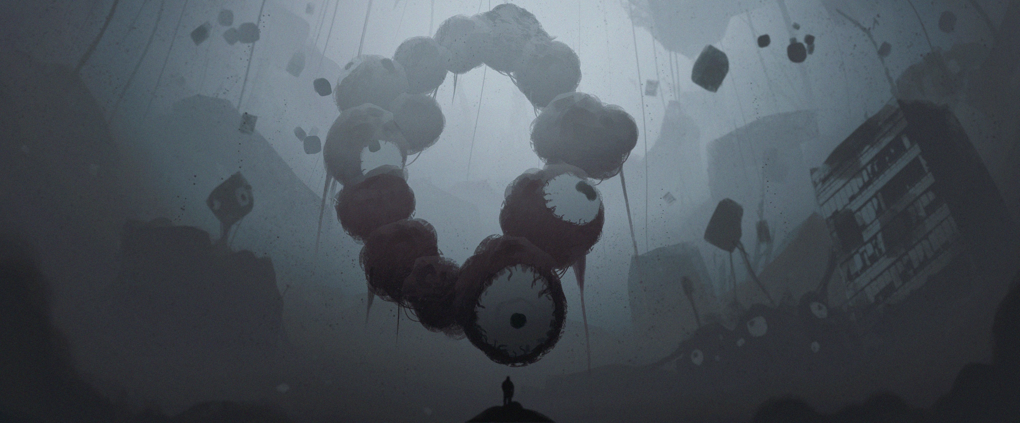 1other absurdres apocalypse asteroid_ill bad_id bad_twitter_id building creature eldritch_abomination expo2025 flesh floating floating_object fog from_behind highres looking_at_another myaku-myaku ruins scenery silhouette tagme