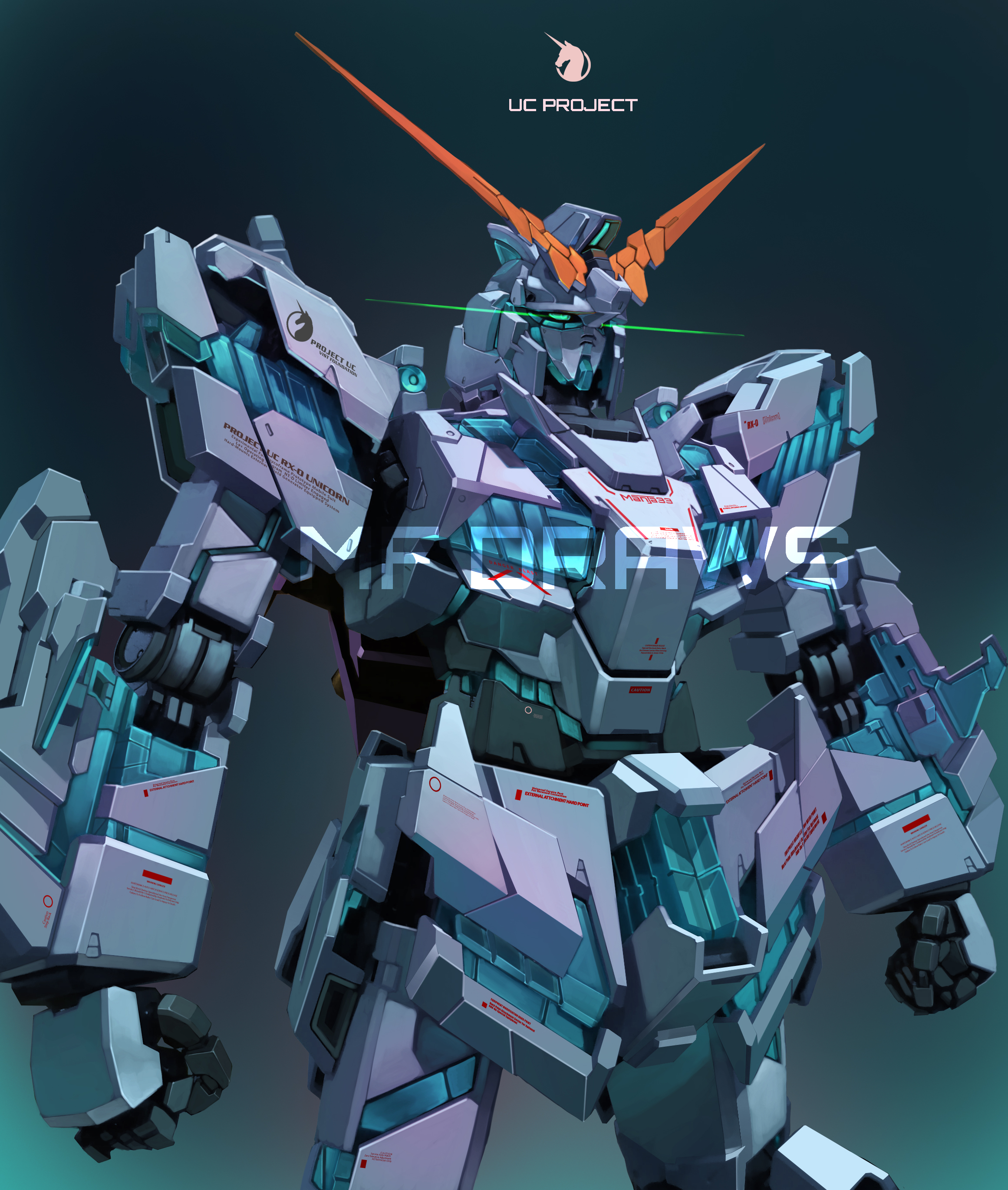 absurdres clenched_hands commentary commission english_commentary glowing glowing_eyes green_eyes gundam gundam_unicorn highres looking_up mecha mf_draws no_humans nt-d photo-referenced robot solo unicorn_gundam upper_body watermark
