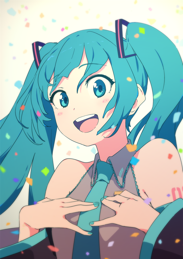 1girl :d bare_shoulders black_sleeves blue_eyes blue_hair blue_nails blue_necktie blush brown_background collared_shirt commentary confetti detached_sleeves grey_shirt hair_between_eyes hair_ornament hands_up hatsune_miku long_hair long_sleeves looking_at_viewer nail_polish necktie open_mouth shirt sleeveless sleeveless_shirt smile sohin solo teeth twintails upper_teeth_only vocaloid wide_sleeves