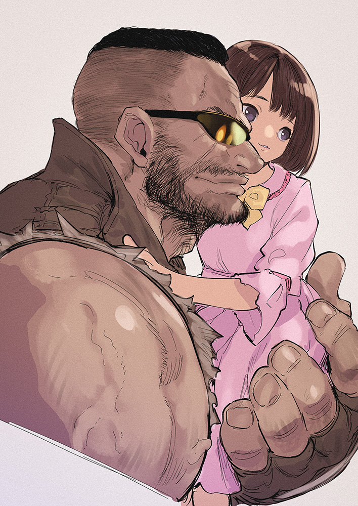 1boy 1girl barret_wallace beard black_eyes black_gloves black_hair bow bowtie carrying child dark-skinned_male dark_skin dress facial_hair father_and_child father_and_daughter final_fantasy final_fantasy_vii final_fantasy_vii_remake fingerless_gloves gloves grey_background hyocorou male_focus manly marlene_wallace parent_and_child pink_dress short_hair short_sleeves simple_background sleeveless sunglasses upper_body vest yellow_neckwear