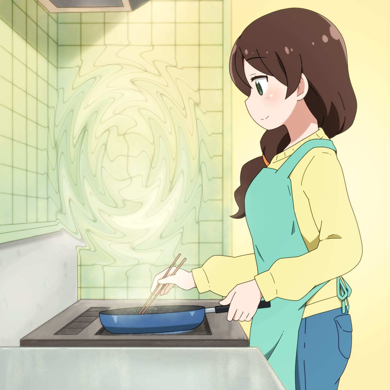 1girl anime_coloring apron blue_apron blue_pants blush brown_hair chopsticks closed_mouth commentary_request cooking cowboy_shot denim from_side frying_pan green_eyes highres holding holding_chopsticks jeans kobayashi-san_chi_no_maidragon long_hair long_sleeves pants profile puffy_long_sleeves puffy_sleeves sasakibe_(maidragon) shirosato smile solo standing stove sweater tile_wall tiles yellow_sweater