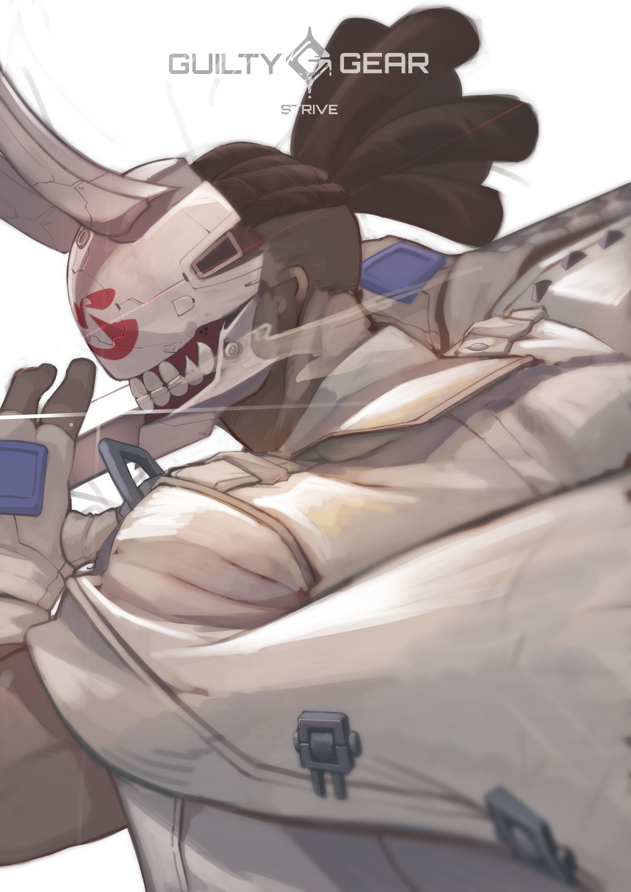 1boy absurdres close-up commentary copyright_name dreadlocks english_commentary from_behind guilty_gear guilty_gear_strive highres holding holding_sword holding_weapon horns male_focus mask mf_draws nagoriyuki open_hand solo sword weapon