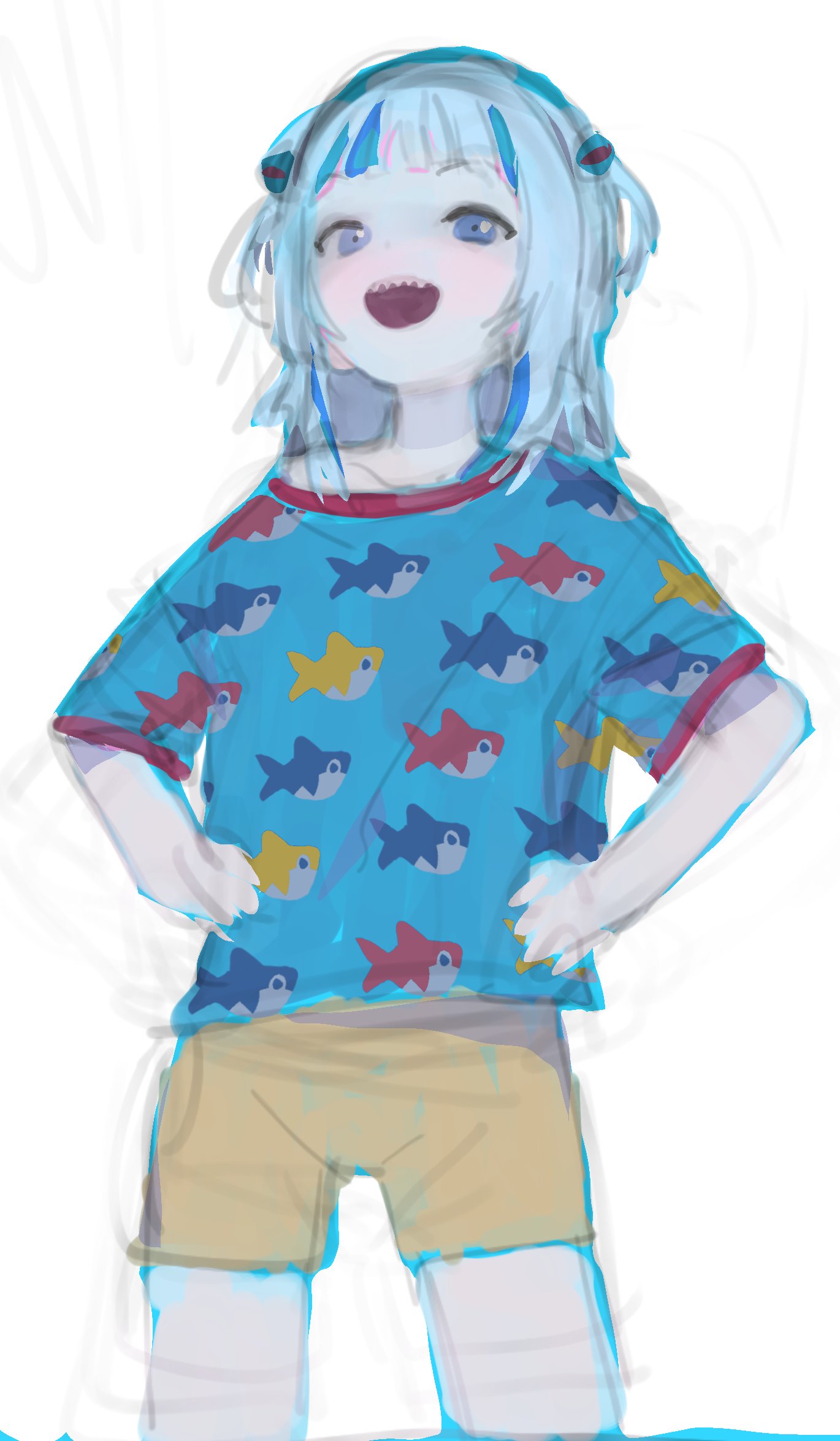 1girl :d alternate_costume blue_eyes blunt_bangs gawr_gura hair_ornament hands_on_own_hips highres hololive hololive_english logknn looking_at_viewer medium_hair multicolored_hair off-shoulder_shirt off_shoulder open_mouth shark_hair_ornament shark_print sharp_teeth shirt shorts simple_background sketch smile solo standing streaked_hair t-shirt teeth virtual_youtuber white_background white_hair