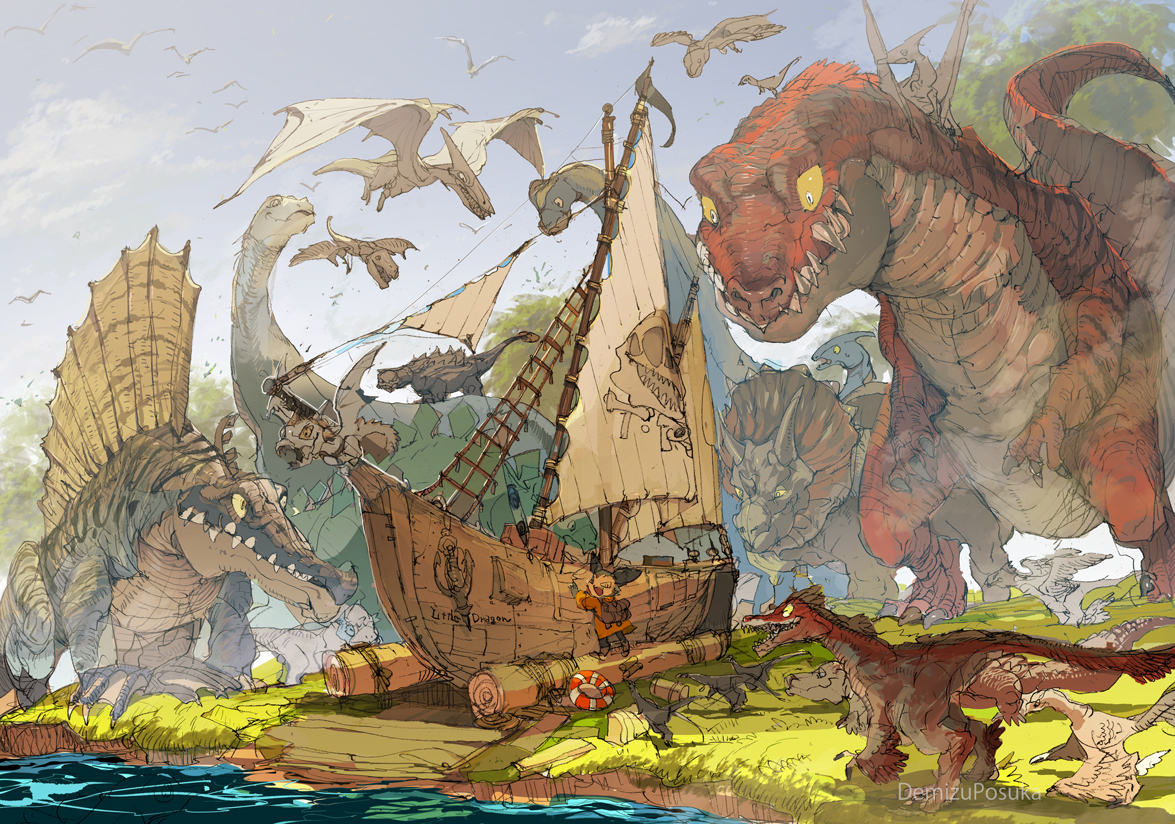 anchor artist_name claws colored_sclera day demizu_posuka dinosaur fantasy feathered_wings flag flying monster original outdoors prehistoric_animal pterosaur sail sauropod sharp_teeth ship teeth water watercraft wings yellow_sclera