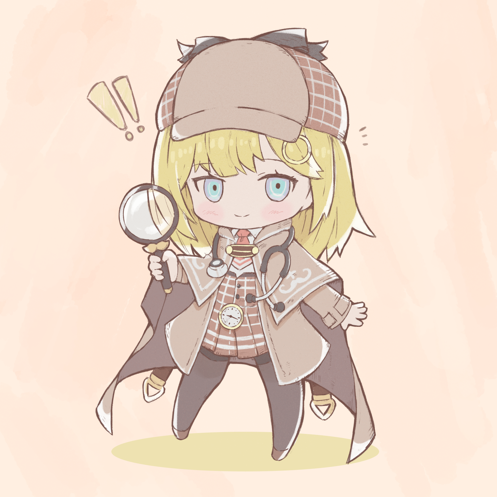 ! !! 1girl blonde_hair blue_eyes chibi commentary detective highres holding holding_magnifying_glass hololive hololive_english magnifying_glass medium_hair metaru open_hand solo stethoscope virtual_youtuber watson_amelia watson_amelia_(1st_costume)
