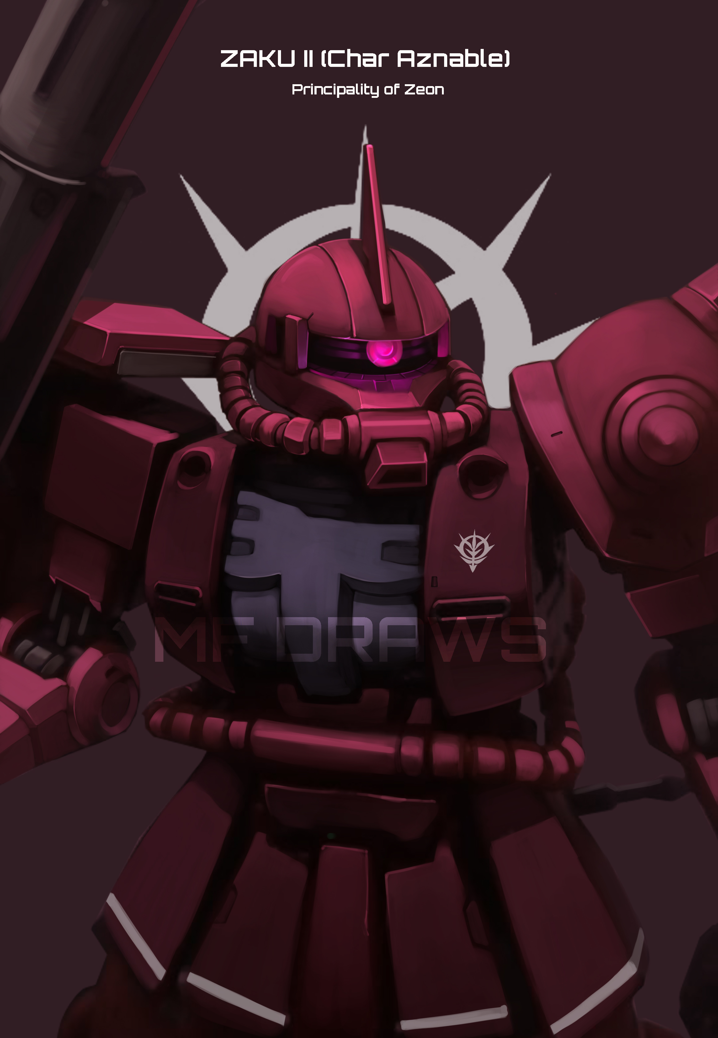 absurdres artist_name character_name close-up commentary commission english_commentary gundam highres looking_to_the_side mecha mecha_focus mf_draws mobile_suit_gundam no_humans one-eyed pink_eyes robot solo watermark zaku_ii_s_char_custom zeon