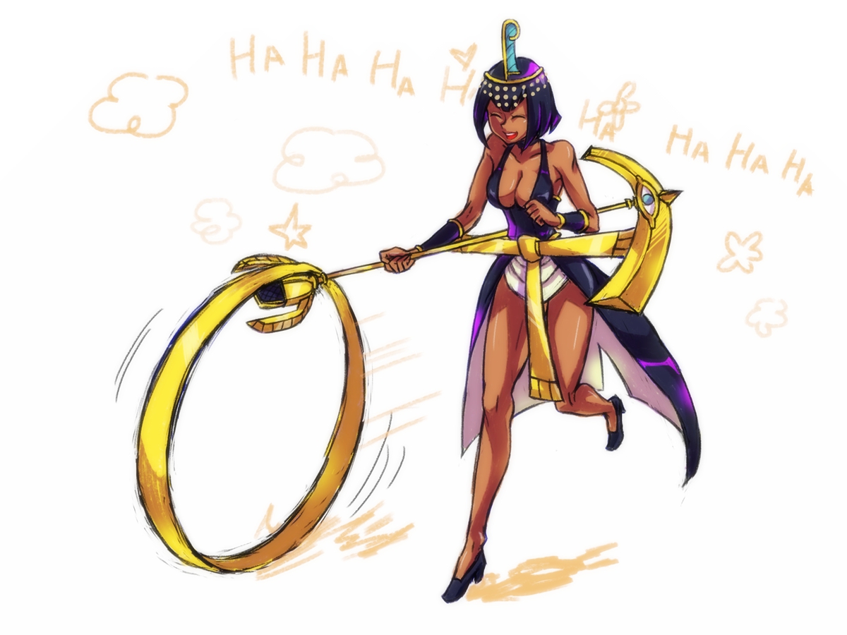 1girl 2014 bob_cut circlet closed_eyes dark-skinned_female dark_skin dress eliza_(skullgirls) female_focus high_heels hoop_rolling laughing microphone_stand open_mouth running short_hair skullgirls smile solo white_background wrist_guards xue_jiang_(simoncry)