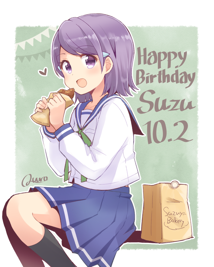 1girl artist_name bakery hair_ornament happy_birthday koisuru_asteroid purple_hair quro_(black_river) school_uniform shop signature smile solo suzuya_moe