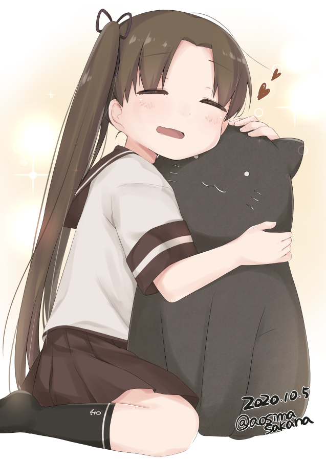 1girl aoshima_sakana ayanami_(kancolle) black_socks brown_hair dated closed_eyes hair_ribbon heart kantai_collection long_hair hugging_object open_mouth pleated_skirt ribbon sailor_collar school_uniform seiza serafuku short_sleeves side_ponytail sitting skirt socks solo stuffed_animal stuffed_cat stuffed_toy twitter_username