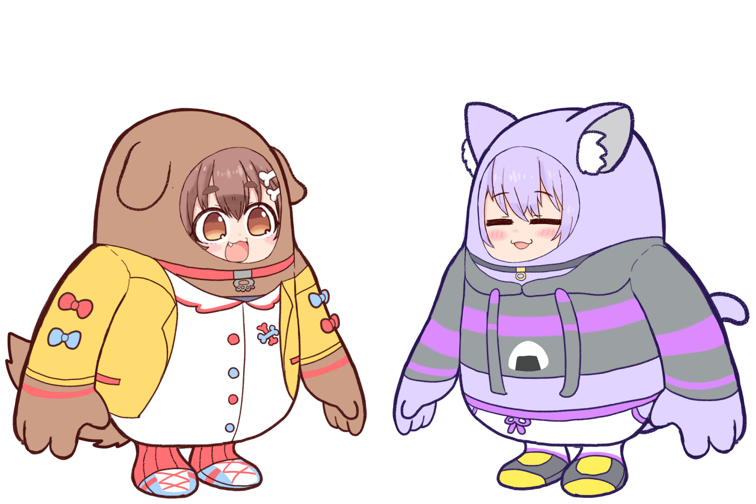 2girls animal_ears blush brown_eyes brown_hair cat_ears closed_eyes collar commentary_request cosplay dog_ears fall_guy fall_guy_(cosplay) fall_guys fang hololive hood hoodie inugami_korone inugami_korone_(1st_costume) jacket matarou_(matarou072) multiple_girls nekomata_okayu nekomata_okayu_(1st_costume) open_mouth purple_hair simple_background tail virtual_youtuber white_background yellow_jacket
