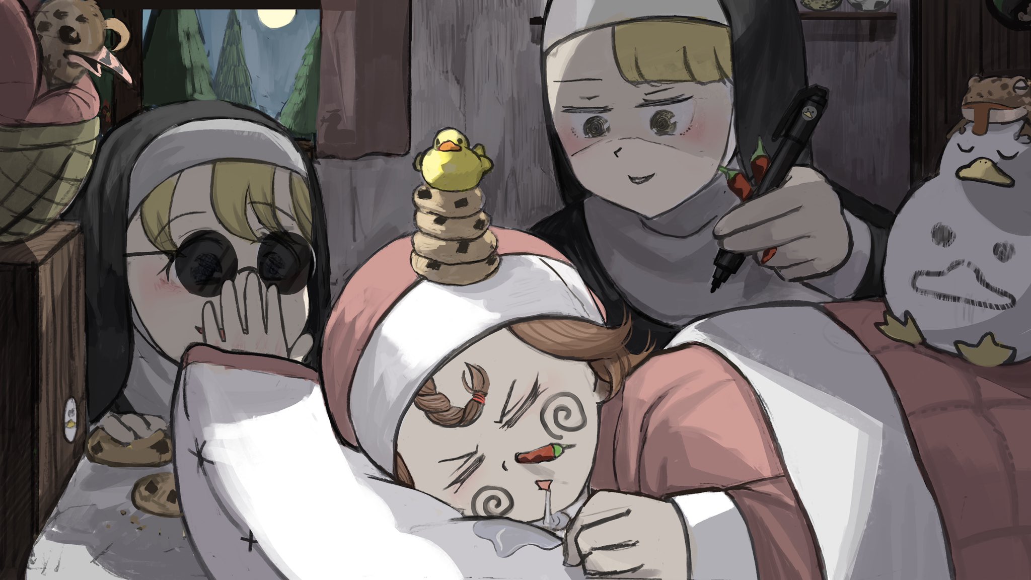 >_< 3girls animal animal_on_back animal_on_head baby_animal ball basket bed bedroom bird blanket blonde_hair braid braided_bangs brown_hair chick chili_pepper chocolate_chip_cookie clear_sky clumsy_nun_(diva) commentary cookie curtains diva_(hyxpk) doodle door drawing_on_another's_face drooling duck english_commentary evil_grin evil_smile food food_on_face food_on_head frog froggy_nun_(diva) full_moon grin habit hand_on_own_face hat highres holding holding_cookie holding_food holding_marker holding_vegetable in_nose laughing little_nuns_(diva) marker moon mouth_hold multiple_girls night nightcap nun nun_headdress object_on_head on_bed on_food on_head open_window original ostrich pajamas pillow prank round_eyewear rubber_duck saliva shaded_face shelf silhouette sky sleeping slice_of_life smile soccer_ball spicy_nun_(diva) sticker sunglasses swirl tongue tongue_out traditional_nun tree triangle_mouth vegetable window wooden_door yellow_eyes