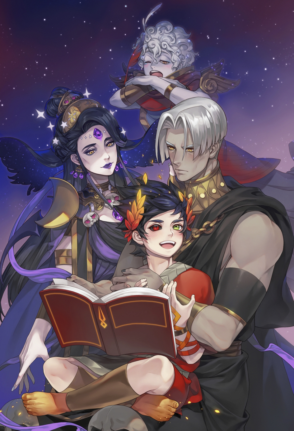 1girl 3boys :d aged_down barefoot black_hair black_nails book brothers child colored_skin crossed_ankles curly_hair earrings feathers forehead_jewel green_eyes grey_skin hades_(series) hades_1 hair_up heterochromia highres hypnos_(hades) jewelry lipstick makeup mature_female mother_and_child mother_and_son multiple_boys nail_polish nyx_(hades) open_mouth pale_skin parent_and_child purple_lips red_eyes siblings sitting skull sleepy smile thanatos_(hades) white_hair winter_(winter168883) yawning yellow_eyes zagreus zagreus_(hades)