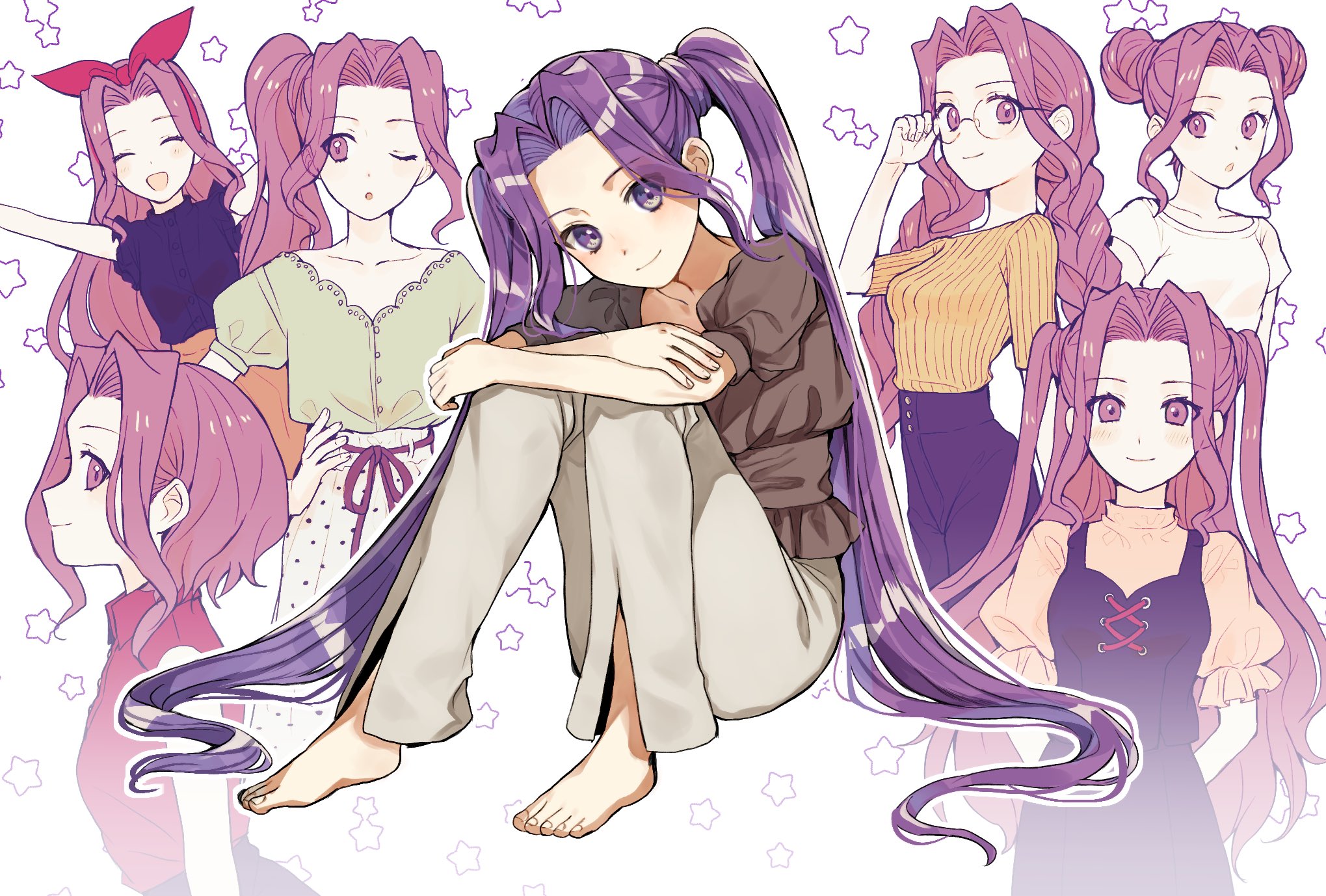 1girl :d :o ^_^ aged_down aikatsu! aikatsu!_(series) alternate_hairstyle barefoot blouse blush bow braid closed_eyes collarbone commentary_request cosplay glasses hair_bow hair_intakes hairband hand_on_own_hip highres hoshimiya_ichigo hoshimiya_ichigo_(cosplay) hugging_own_legs kanzaki_mizuki kurodeko long_hair looking_at_viewer multiple_views open_mouth outstretched_arms pants polka_dot polka_dot_pants ponytail puffy_short_sleeves puffy_sleeves purple_eyes purple_hair shirt short_hair short_sleeves sitting sleeveless sleeveless_shirt smile star_(symbol) star_symbol_background t-pose t-shirt twin_braids twintails two_side_up very_long_hair white_background