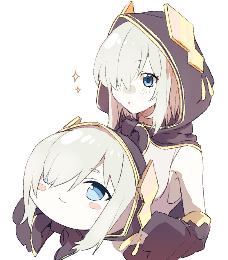 1girl :o ars_almal ars_almal_(1st_costume) black_sleeves blue_eyes blush_stickers character_doll cloak commentary_request detached_sleeves doll hair_over_one_eye hood hood_up hooded_cloak keiasik nijisanji shirt simple_background sketch sleeveless sleeveless_shirt smile solo sparkle upper_body virtual_youtuber white_background white_hair