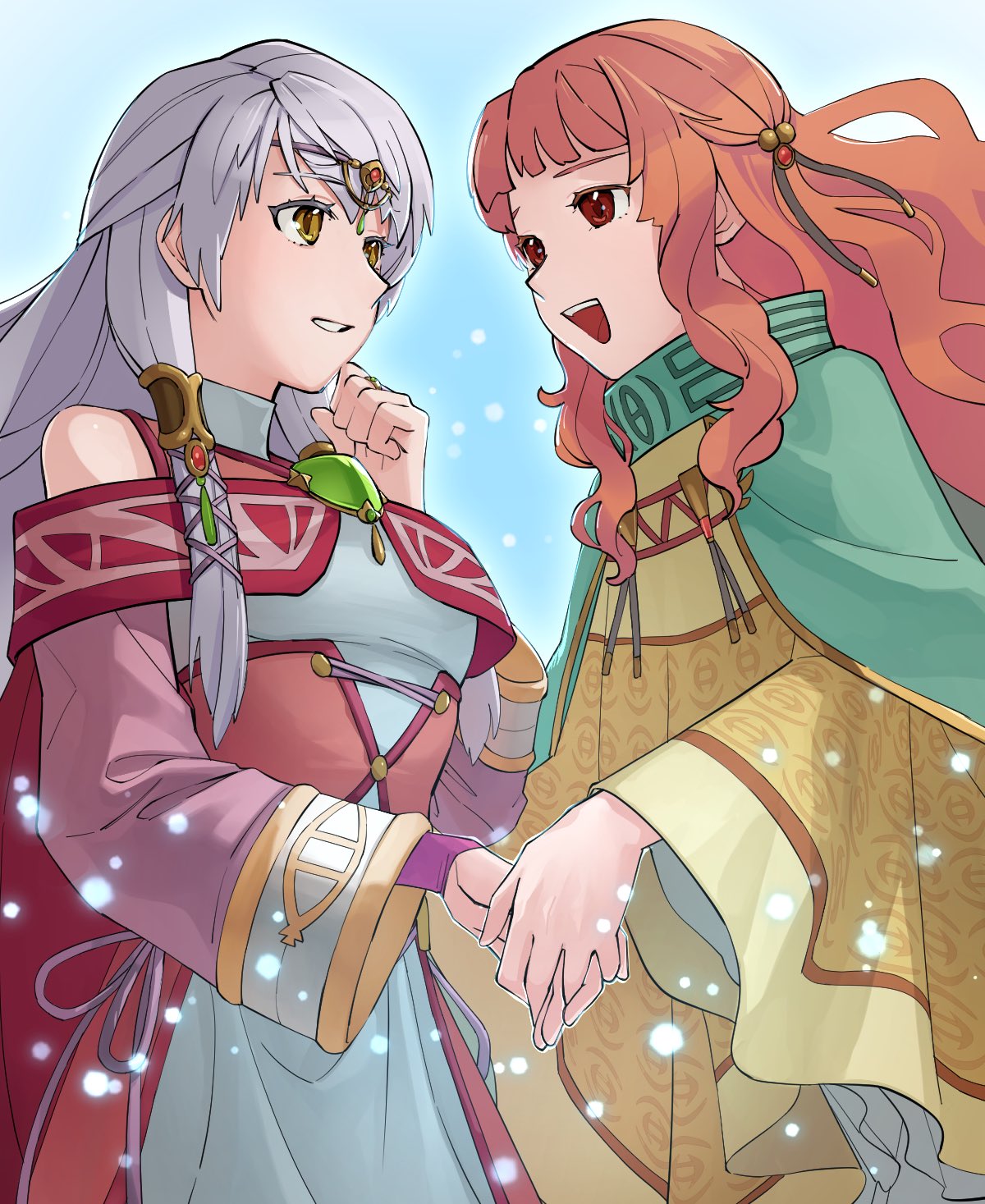 2girls :d asagi_(banzoku210) bangle bare_shoulders bracelet circlet detached_sleeves dress fire_emblem fire_emblem:_radiant_dawn half_updo highres holding_hands jewelry long_hair long_sleeves micaiah_(fire_emblem) micaiah_(queen_of_dawn)_(fire_emblem) multiple_girls nintendo open_mouth orange_eyes orange_hair silver_hair simple_background smile teeth wide_sleeves yellow_eyes yune_(fire_emblem)