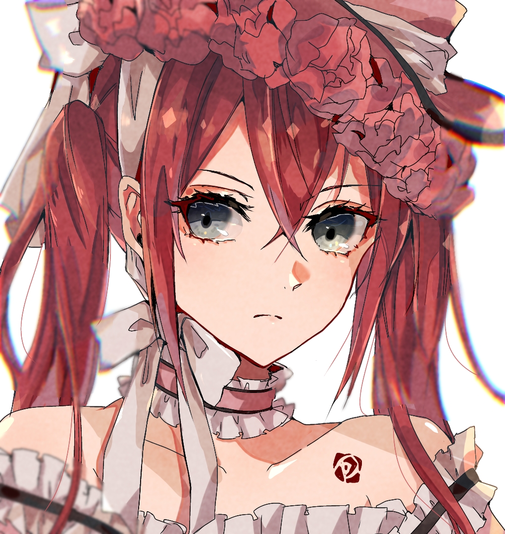 1boy blurry choker chromatic_aberration ciel_phantomhive ciel_phantomhive_(cosplay) ciel_phantomhive_(robin_dress) collarbone cosplay crossdressing crossdressing_(mtf) expressionless eyeliner formal_clothes frilled_choker frills grey_eyes hat hat_ribbon makeup male_focus off_shoulder portrait red_hair ribbon ribbon_choker riddle_rosehearts solo strapless tooka_(wakanda) twintails twisted_wonderland