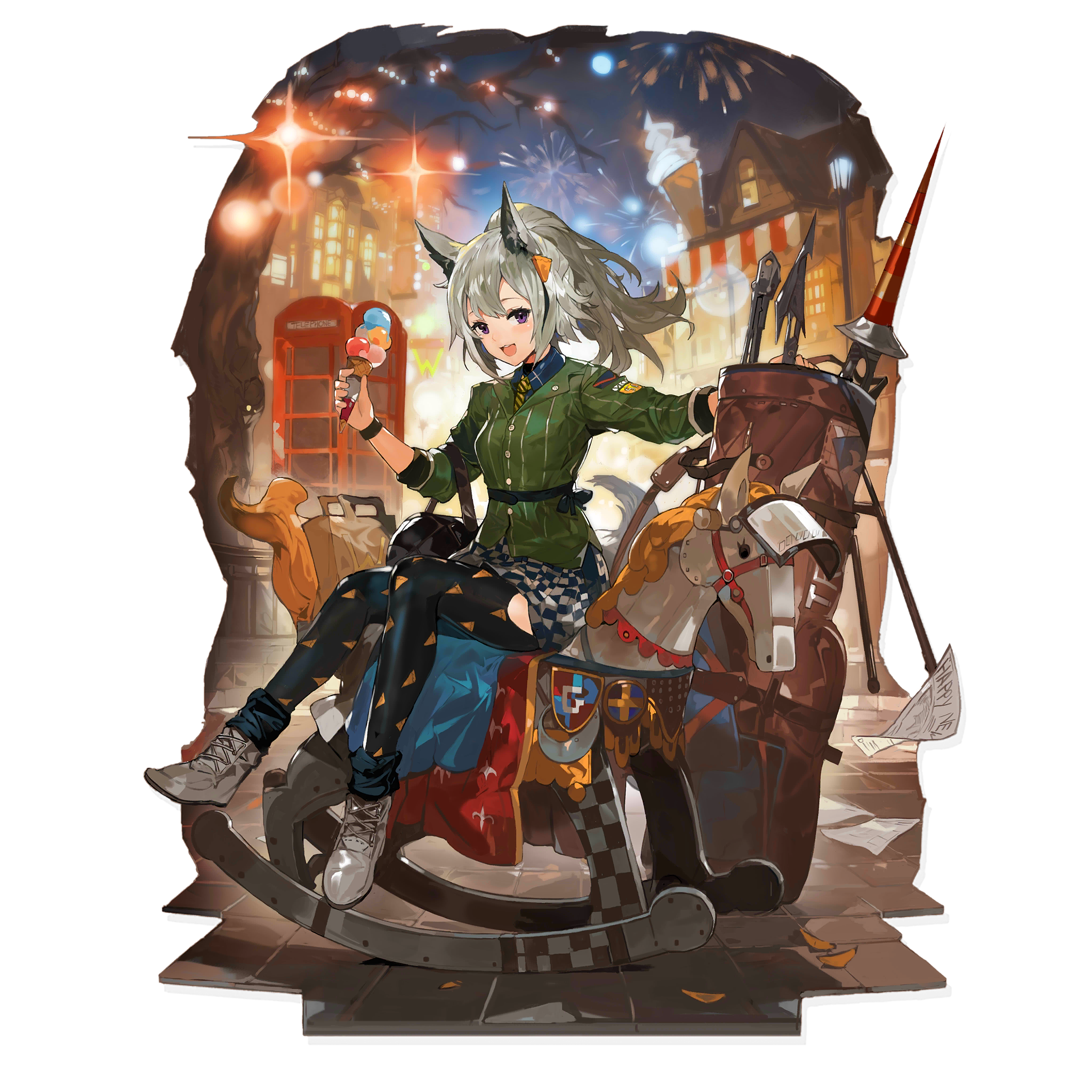 1girl :d alchemaniac animal_ears arknights black_pantyhose breasts building checkered_clothes checkered_skirt fireworks food grani_(arknights) grani_(miraculous_moment)_(arknights) green_shirt grey_shoes hair_between_eyes highres holding holding_food ice_cream ice_cream_cone long_hair looking_at_viewer miniskirt night official_alternate_costume official_art open_mouth pantyhose phone_booth ponytail purple_eyes shirt shoes silver_hair sitting skirt sky small_breasts smile sneakers solo transparent_background