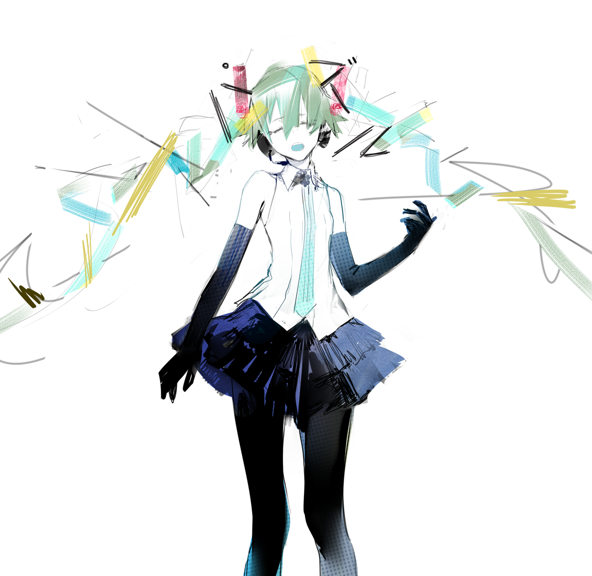 1girl absurdly_long_hair anniversary aqua_eyes aqua_hair aqua_necktie artist_name artist_request bare_shoulders birthday black_gloves black_skirt black_thighhighs blue_eyes blue_hair blue_necktie boots breasts closed_eyes collarbone commentary elbow_gloves facing_viewer feet_out_of_frame female_focus gloves green_hair happy_birthday hatsune_miku headphones headset layered_skirt long_hair miniskirt necktie open_mouth parted_lips plaid_clothes plaid_skirt pleated pleated_skirt puzzle_(vocaloid) shirt skirt sleeveless sleeveless_shirt small_breasts smile solo song_name standing thigh_boots thighhighs twintails very_long_hair vocaloid white_background white_shirt wing_collar yyb