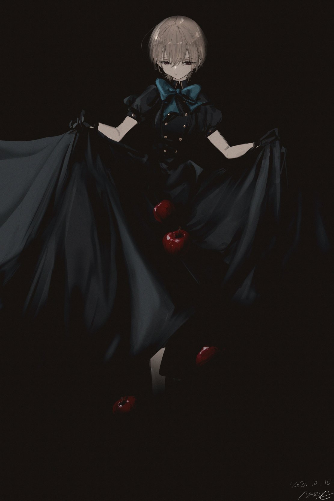 1girl apple black_background black_dress black_gloves blonde_hair blue_bow blue_bowtie bow bowtie buttons collared_dress double-breasted dress food fruit full_body gloves highres holding_own_dress long_dress narue original puffy_short_sleeves puffy_sleeves red_eyes short_hair short_sleeves smile solo