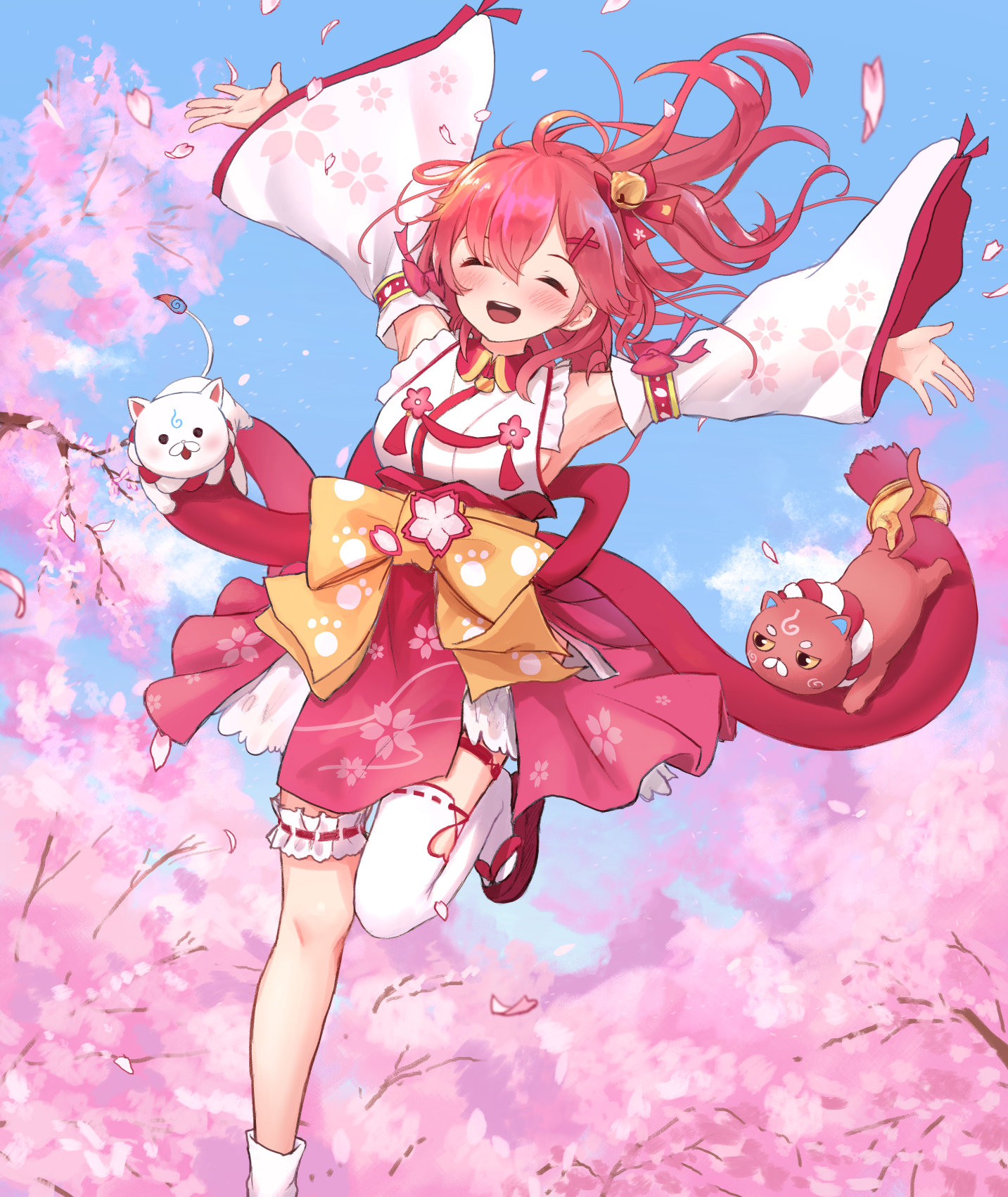 1girl ahoge armpits asymmetrical_legwear bell blue_sky blush breasts cherry_blossom_print cherry_blossoms closed_eyes cloud commentary_request day detached_sleeves falling_petals floral_print frilled_thigh_strap hair_bell hair_ornament hair_ribbon highres hololive jingle_bell medium_breasts nontraditional_miko obi one_side_up open_mouth orange_hair outdoors petals ribbon roke_(taikodon) sakura_miko sakura_miko_(1st_costume) sandals sash sideboob single_thighhigh skirt sky smile solo thigh_strap thighhighs uneven_legwear virtual_youtuber white_thighhighs wide_sleeves x_hair_ornament zouri
