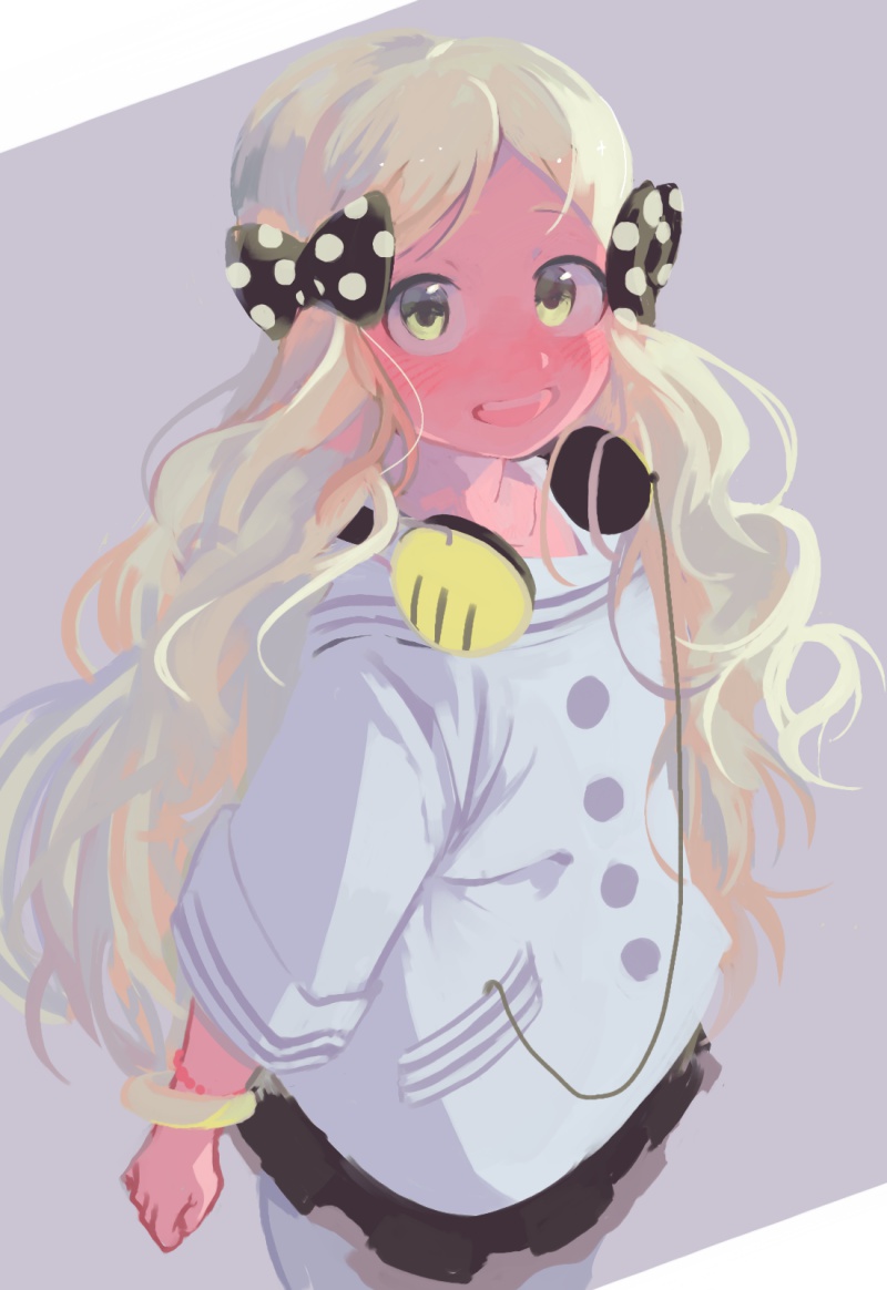 1girl :d black_skirt blonde_hair blush bow bracelet grey_eyes hair_bow handa_roco headphones headphones_around_neck idolmaster idolmaster_million_live! jewelry kumofuki kumofuki long_hair long_sleeves looking_at_viewer open_mouth pocket polka_dot polka_dot_bow sailor_collar shirt simple_background skirt smile solo twintails two-tone_background white_shirt yellow_eyes