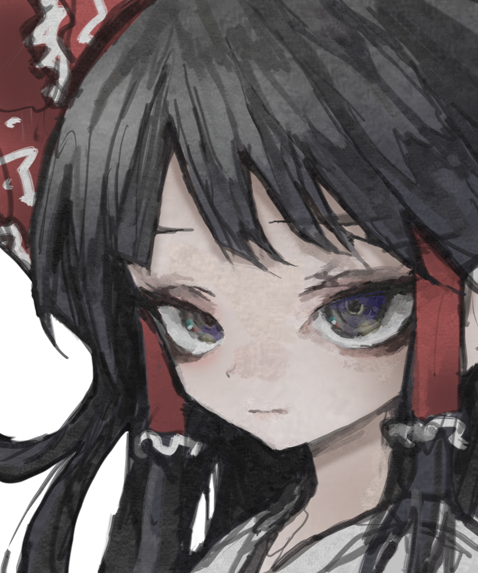 1girl ashitano_kirin black_hair bow commentary_request hair_bow hair_tubes hakurei_reimu long_hair looking_at_viewer one-hour_drawing_challenge portrait red_bow sanpaku simple_background solo touhou white_background