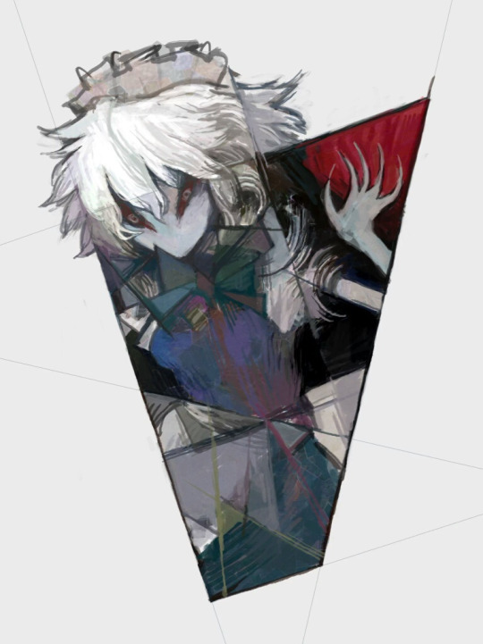1girl abstract apron ashitano_kirin blue_dress colored_sclera commentary_request dress grey_background hand_up izayoi_sakuya maid_headdress red_sclera shirt short_hair short_sleeves solo touhou upper_body waist_apron white_hair white_shirt