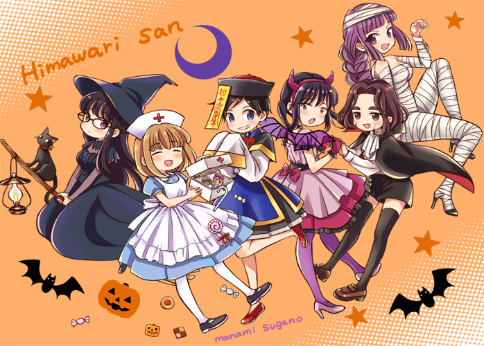 6+girls :d apron artist_name bandages bat_(animal) black-framed_eyewear black_cape black_cat black_dress black_hair black_headwear black_legwear black_shoes black_skirt blue_dress blue_eyes blunt_bangs blush bow braid breasts broom broom_riding brown_hair brown_shoes candy candy_cane cape cat character_name closed_eyes commentary cookie copyright_name crescent cross demon_horns dress fake_horns fake_wings first_aid_kit food glasses gloves grin hairband halloween halloween_costume hand_up happy hat high_heels himawari-san himawari-san_(character) holding_hands horns jack-o'-lantern jiangshi kazamatsuri_fuuko kazamatsuri_matsuri lantern light_brown_hair lollipop long_hair long_sleeves looking_at_viewer mary_janes medium_breasts minami_ami multiple_girls mummy_costume nanase_nanako nurse nurse_cap ofuda open_mouth orange_background pantyhose pink_dress purple_bow purple_eyes purple_gloves purple_hair purple_hairband purple_legwear purple_shoes qingdai_guanmao red_cross red_shoes shirt shoes short_hair siblings single_braid sisters skirt sleeves_past_fingers sleeves_past_wrists smile standing standing_on_one_leg star_(symbol) sugano_manami swirl_lollipop tachibana_ritsuka_(himawari-san) thighhighs vampire_costume wavy_hair white_apron white_headwear white_legwear white_shirt wide_sleeves wings witch witch_hat