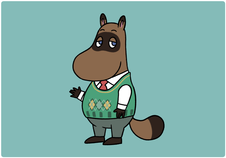 1boy animal_crossing animal_ears aqua_background blue_eyes border collared_shirt full_body furry furry_male green_vest grey_pants half-closed_eyes hand_up long_sleeves looking_to_the_side male_focus moomin necktie nintendo no_mouth pants raccoon_boy raccoon_ears raccoon_tail red_necktie shirt simple_background solo standing tail tom_nook_(animal_crossing) tsutsuji_(hello_x_2) vest white_border white_shirt