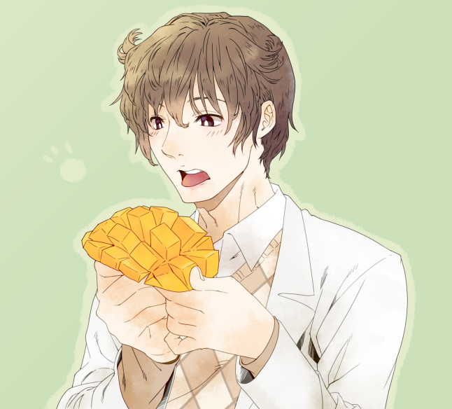 1boy animal_crossing argyle_clothes argyle_sweater blathers_(animal_crossing) blush brown_eyes brown_hair brown_sweater collared_shirt eating fruit green_background green_outline hands_up holding humanization jacket light_blush long_sleeves looking_down male_focus mango nintendo open_mouth outline own_hands_together paw_print shirt short_hair simple_background solo sweater teeth tongue tsutsuji_(hello_x_2) upper_body white_jacket white_shirt