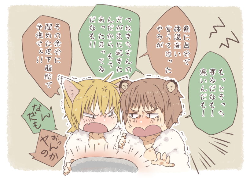 2boys ahoge anger_vein animal_crossing animal_ears annoyed black_eyes blanket blonde_hair blush border brown_background brown_hair cold collarbone eye_contact fox_boy fox_ears half-closed_eyes heater humanization japanese_text looking_at_another male_focus multiple_boys nintendo nose_blush open_mouth outline raccoon_boy raccoon_ears redd_(animal_crossing) short_hair simple_background speech_bubble talking text_focus tom_nook_(animal_crossing) translation_request trembling tsutsuji_(hello_x_2) upper_body v-shaped_eyebrows white_border white_outline