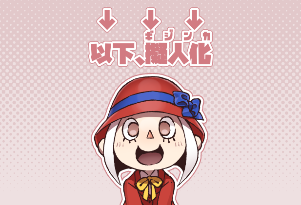 1girl animal_crossing arrow_(symbol) blue_bow blue_ribbon blush bow brown_eyes cloche_hat female_focus flat_chest gradient_background halftone halftone_background happy hat hat_bow hat_ribbon jacket japanese_text light_blush looking_at_viewer neck_ribbon nintendo open_mouth outline pink_background pink_outline red_hat red_jacket ribbon shirt short_hair sidelocks simple_background smile solo straight-on text_focus translation_request tsutsuji_(hello_x_2) upper_body villager_(animal_crossing) white_hair white_outline white_shirt yellow_ribbon
