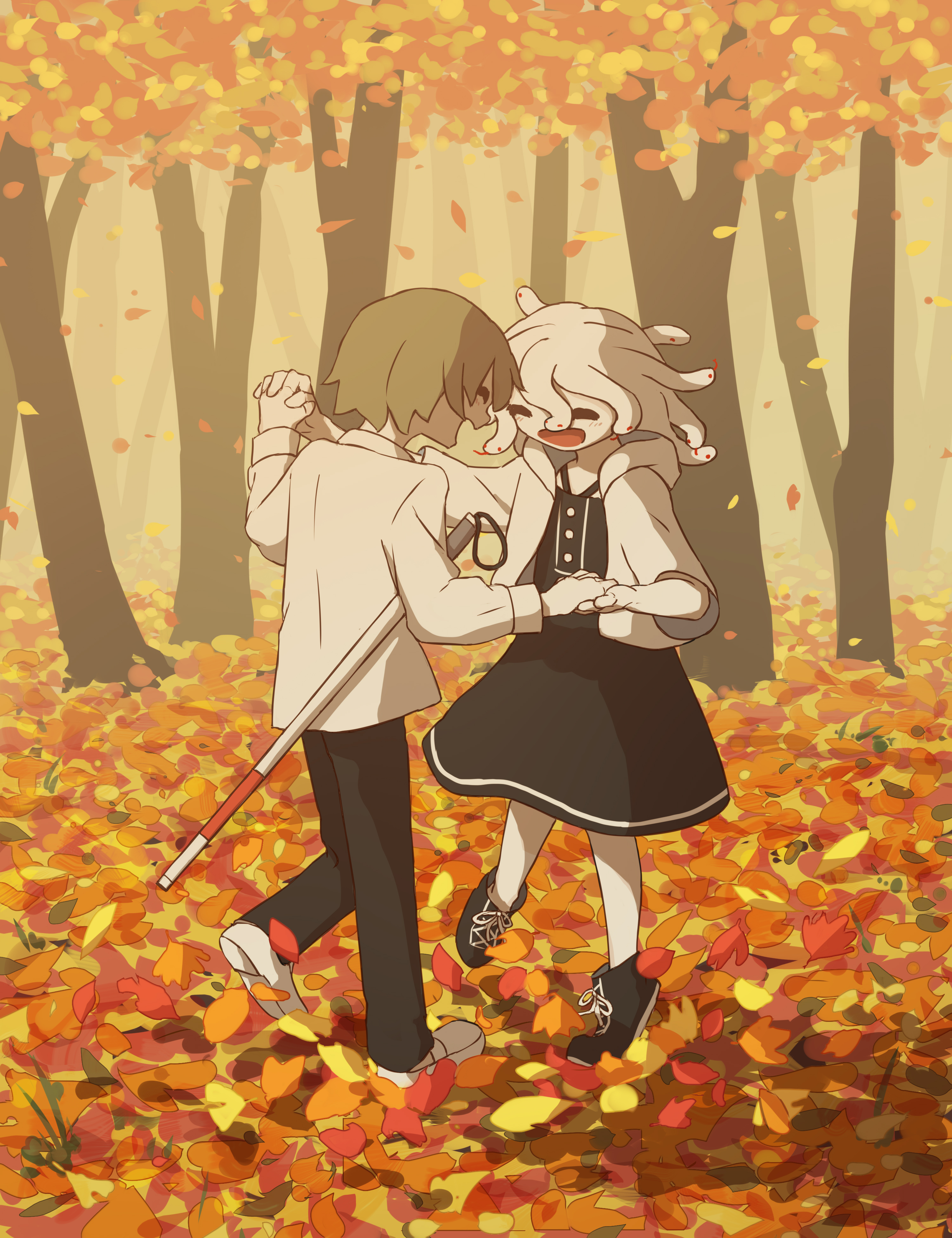 1boy 1girl absurdres autumn_leaves avogado6 bare_legs black_dress black_footwear black_pants blind brown_hair cane closed_eyes coat commentary_request dancing dress happy highres leaf long_sleeves open_mouth original outdoors pants shirt short_hair smile snake snake_hair tree white_cane white_coat white_shirt white_snake