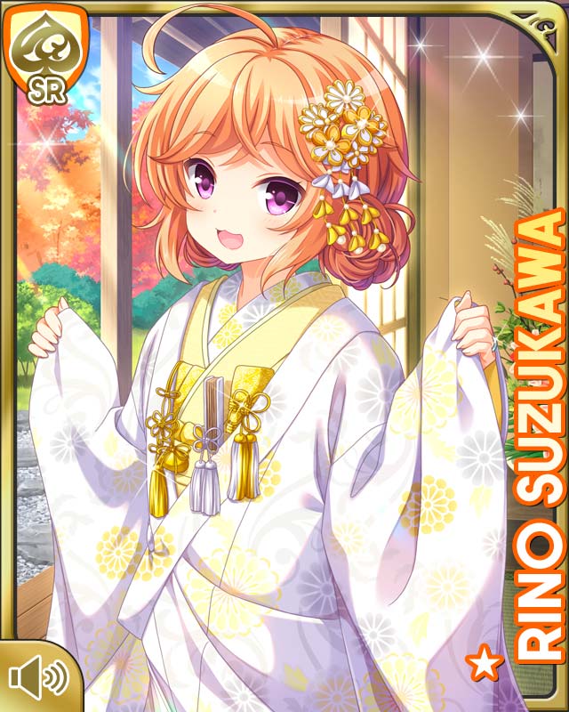 1girl ahoge brown_hair card_(medium) cat_smile character_name day flower girlfriend_(kari) hair_bun hair_flower hair_ornament hands_in_sleeves japanese_clothes kimono official_art open_mouth outdoors park purple_eyes qp:flapper shoes single_hair_bun socks solo suzukawa_rino white_kimono