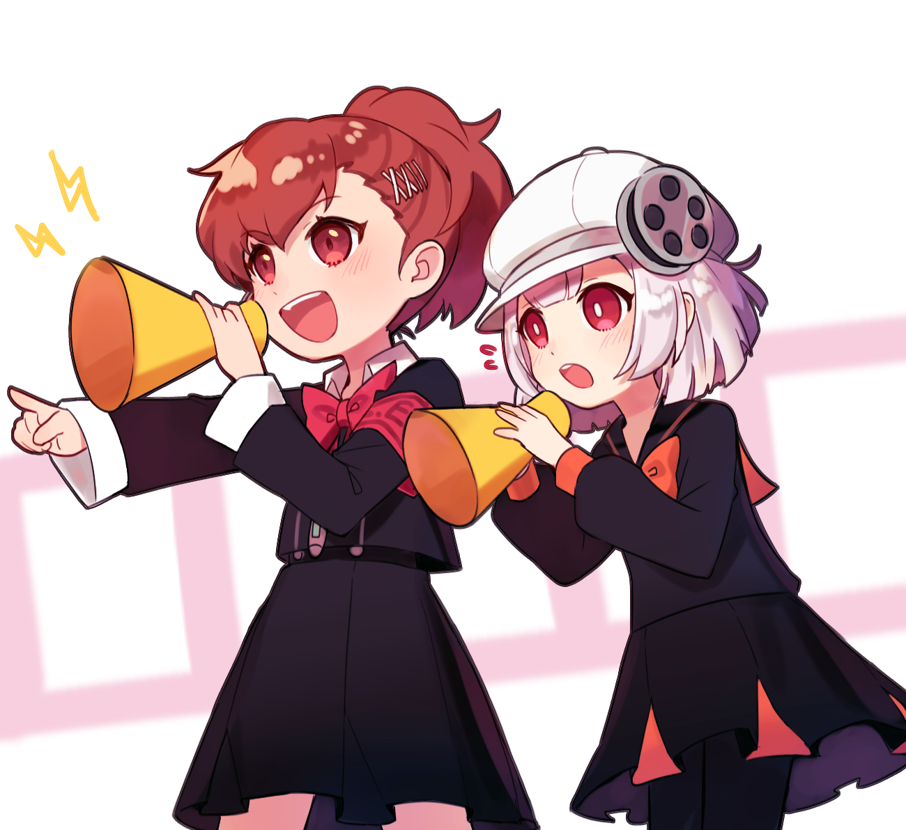 2girls :d :o armband bright_pupils brown_hair byoru newsboy_cap eyebrows flying_sweatdrops gekkoukan_high_school_uniform hat hikari_(pq2) lightning_bolt_symbol long_sleeves medium_hair megaphone multiple_girls open_mouth pantyhose persona persona_q2:_new_cinema_labyrinth persona_q_(series) pleated_skirt pointing ponytail red_armband red_eyes ribbon school_uniform serafuku shiomi_kotone short_hair skirt smile teeth upper_teeth_only white_hair white_headwear white_pupils