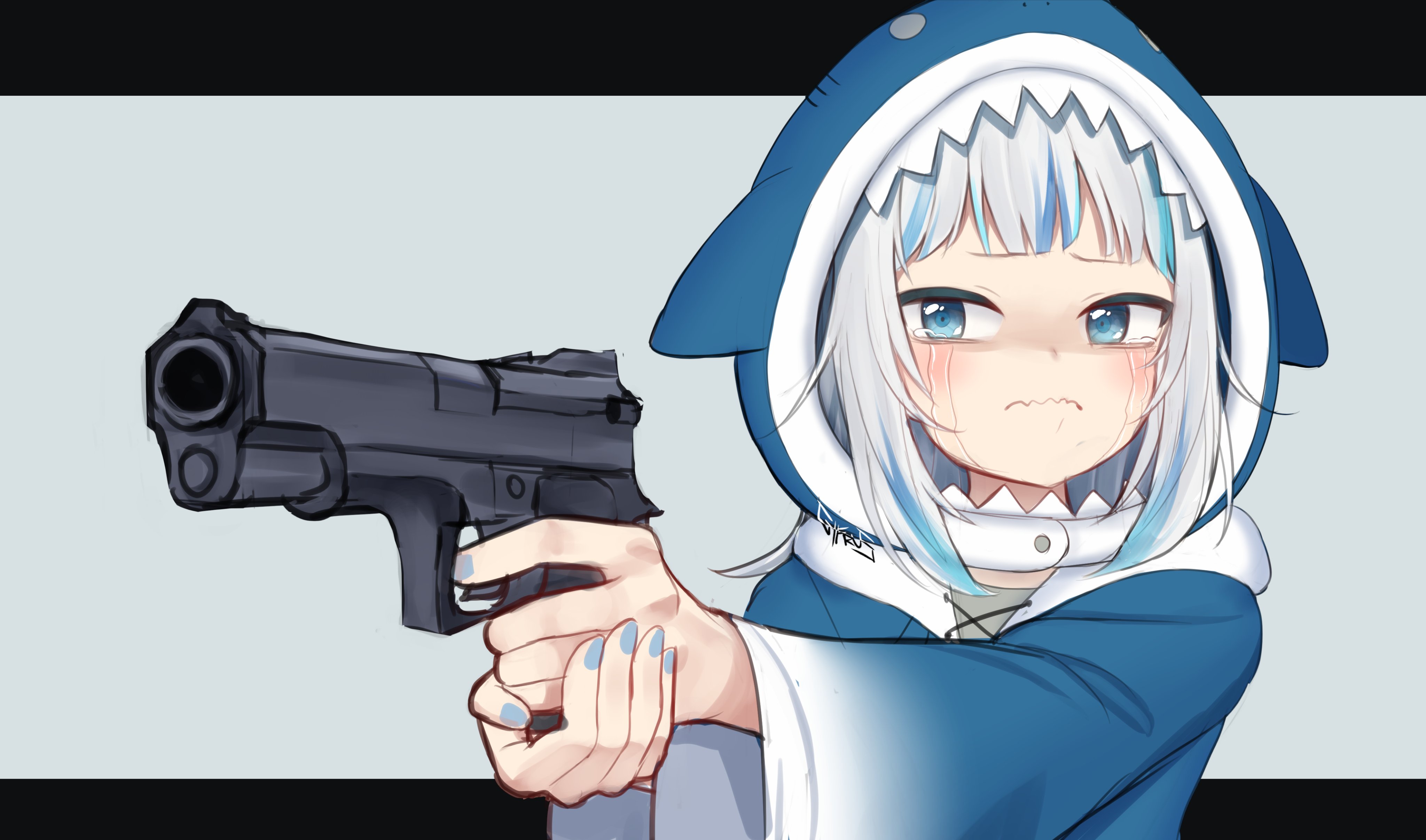 1girl a_way_out absurdres aiming animal_hood blue_eyes blue_hoodie crying cyfrus gawr_gura gawr_gura_(1st_costume) grey_background gun handgun highres holding holding_weapon hololive hololive_english hood hoodie long_hair long_sleeves meme nail_polish pistol signature solo spoilers streaming_tears tears upper_body virtual_youtuber wavy_mouth weapon wide_sleeves