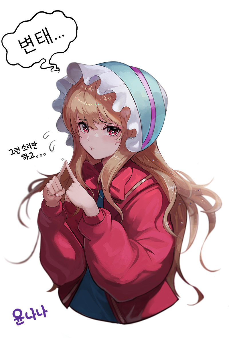 1girl blonde_hair blush bow closed_mouth commentary_request commission cropped_torso hat index_fingers_together jacket long_hair long_sleeves looking_at_viewer moth1 original pouty_lips puffy_sleeves red_bow red_eyes red_jacket shirt simple_background solo sweatdrop translation_request white_background