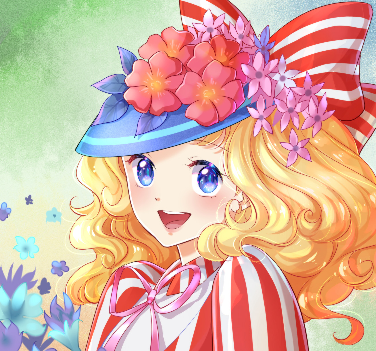 1girl :d blonde_hair blue_eyes blue_headwear bow candice_white_ardlay candy_candy_(series) day derivative_work flower green_background hat hat_bow hat_flower highres kaminary long_hair looking_at_viewer open_mouth outdoors pink_ribbon red_bow ribbon screenshot_redraw shirt simple_background smile striped_bow striped_clothes striped_shirt