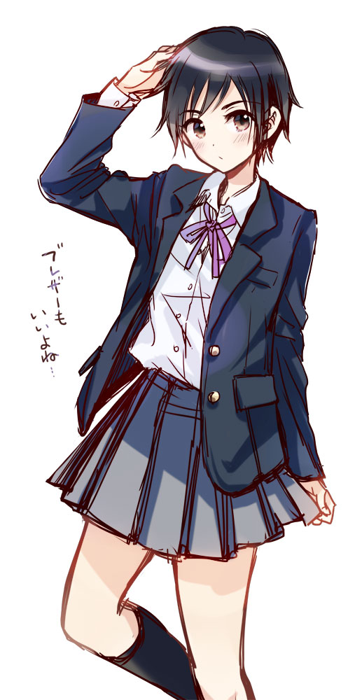 1girl arm_up black_hair black_jacket black_socks blazer blush brown_eyes buttons collared_shirt commentary cowboy_shot dress_shirt grey_skirt himawari-san jacket kazamatsuri_fuuko kneehighs long_sleeves looking_at_viewer neck_ribbon open_clothes open_jacket pleated_skirt purple_ribbon ribbon shirt shirt_tucked_in short_hair simple_background sketch skirt socks solo standing sugano_manami translation_request white_background white_shirt